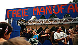 auf dem Float ist ein Banner mit der Aufschrift freie manufaktur, darunter sieht man einen Typ mit einer weißen Sonnenbrille